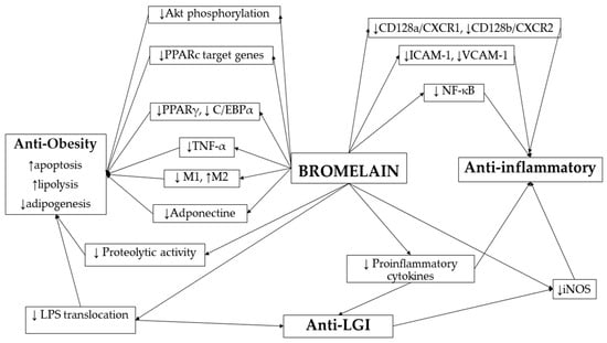 Bromelain signaling pathways during anti-obesity, anti-inflammation, and anti-low-grade-inflammation effects [,,,,,,,,,,,,,,,,,,,,,,,,,,]. The effects of bromelain are marked as follows: ↑ increased, ↓ decreased.