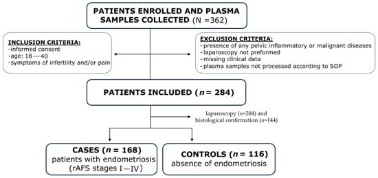 A total of 362 patients were included in the study based on the following inclusion criteria: signed informed consent, reproductive age (18–40 years), problems with infertility, and/or symptoms suggestive of endometriosis. The exclusion criteria were the presence of pelvic inflammatory or malignant disease, laparoscopic surgery not performed, plasma samples not processed according to the SOP, and missing clinical data. After applying the exclusion criteria, the final study cohort comprised 284 patients. All patients underwent laparoscopy and were characterised by the presence of endometriosis (cases, n = 168) and the absence of endometriosis (controls, n = 116). Patients with endometriosis were categorised into stages I–IV (from minimal/mild to moderate/severe) according to the revised American Fertility Society (rAFS) score (Figure 1). Potential confounders such as menstrual cycle phase, hormonal therapy, or inflammation markers were not part of the inclusion or exclusion criteria for patient selection.