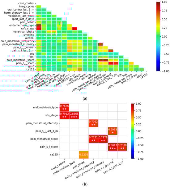 Pearson’s correlation matrix between dataset variables: (a) Pearson’s correlation matrix used for multicollinearity estimation. Y-scale showing strength and direction of an association between variables; (b) identified correlated variables inside correlation matrix. One white star represents association cutoff above 0.60, two white stars represents association cutoff above 0.70, and three white stars represents association cutoff above 0.80 value. Y-scale showing strength and direction of an association between variables.