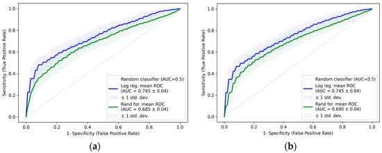 The average AUC value of the combined logistic regression model of GAS6 and CA-125 was comparable to the single CA-125 model, with an AUC value of 0.745 ± 0.04 and an average AIC value of 218.52 ± 6.81. The average sensitivity did not improve, while the average specificity improved slightly compared to the single CA-125 model. The random forest models improved slightly compared to the random forest models of a single CA-125 model. The data can be seen in Table 3 and Figure 6.