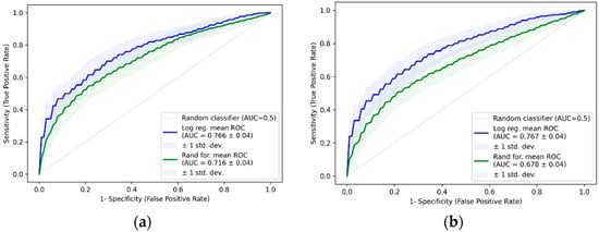 Receiver operating characteristic (ROC) curves for combined logistic regression and random forest models: (a) combined CA-125 and frequency of dysmenorrhea logistic regression and random forest models; (b) combined CA-125, sport/recreation in the last two days before surgery, and dysmenorrhea score logistic regression and random forest models.