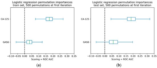 AUC predictor importance of the combined GAS6 and CA-125 logistic regression model using the permutation feature importance method. Data for (a) training and (b) test set are shown.