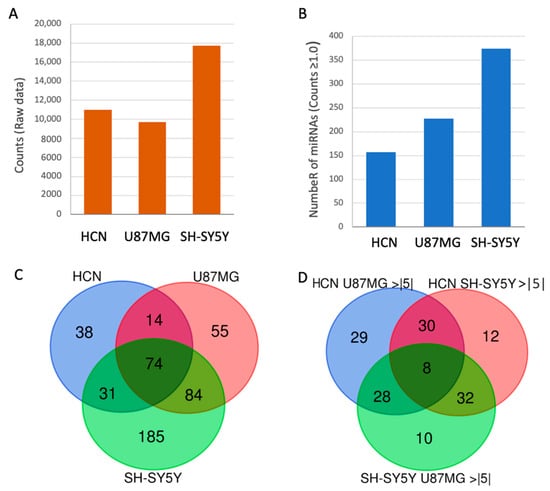 Changes in expression of SF-miRNAs among neuronal cancer—origin cell lines. (A) Changes in number of reads. (B) Changes in the number of SF-miRNA of the 3 neuronal cell lines (above a minimal expression level). (C) Venn diagram showing the partition of different SF-miRNAs among three neuronal cancer cell lines. (D) Venn diagram showing the partition of different SF-miRNAs among the three neuronal cancer cell lines showing at least 5× fold change (for up and down regulation).