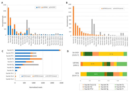 The analysis further revealed the expression of a large collection of spliceosomal let-7 miRNAs in the neuronal cancer cells. Family members of hsa-let-7 (11 miRNAs) were among the most significantly SF-expressing miRNAs. They accounted for 28% of all reads from the three cell lines. The difference in expression is illustrated in Figure 2C. For example, in the HCN cell line, the total reads for the SF-miRNA let-7 family members were 4.2 times higher than in the other cell lines and accounted for 57% of all expressed miRNAs in this cell. The dominant type of HCN was hsa-let-7c (Figure 2C). The differences in the composition of SF hsa-let-7 in the different neuronal cell lines are evident, with hsa-let-7g, hsa-let-7b, and hsa-let-7c dominating SH-SY5Y, U87MG, and HCN, respectively (Figure 2D).