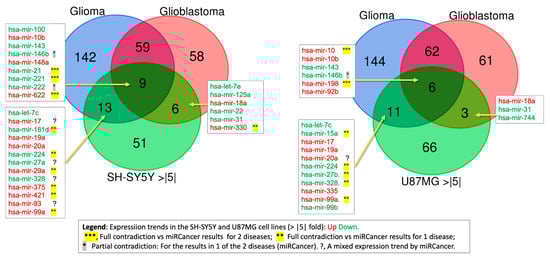 Overlap of miRNA expression trend from CNS cancer and SF-miRNAs from cancerous cell lines. The Venn diagram shows the overlap between differentially expressed SF-miRNAs (≥5-fold change) in SH-SY5Y (left) or U87MG (right) cell lines, and miRNAs reported in miRCancer database for glioma and glioblastoma. Names of the miRNAs are listed, with the colors marking the expression trend. Up and Down regulation are indicated with red and green font, respectively. The legend indicates the symbols that describes the degree of contradiction of cell line expression trend and the miRCancer data.
