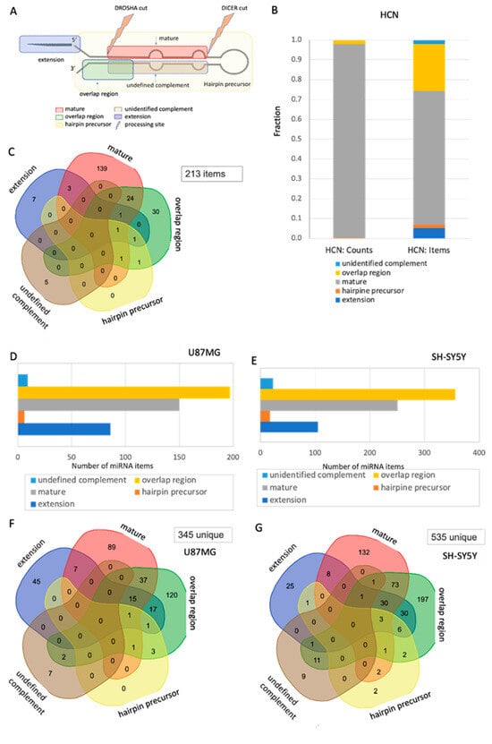 In the case of the HCN cell line, Figure 4B shows that almost all the SF-miRNA-derived sequences are assigned to mature miRNA (98%). By accounting only for the number of unique items (a total of 250 items), the fraction of overlapping regions with other segments is more substantial (33%). Figure 4C provides a detailed analysis of the overlaps between different segmental groups. We observed that the mature miRNAs and overlapping regions exhibit substantial overlap, while the rest of the segmental types are negligible. Altogether, there were 250 references of SF-miRNAs that accounted for 213 unique items (due to having the same miRNA in more than one segmental group). The occurrence of 30 SF-miRNAs that are only identified as overlapping regions and SF-miRNAs that show evidence of unidentified complement sequences (miR-1281, miR-636, miR-4737, miR-555, and miR-3685) highlights alterations in processing and the potential role of nonconventional transcripts at the spliceosome. Unlike SF-miRNA in HCN cells, in which most of the types are mature miRNA, in both neuronal cancer cells (U87MG and SH-SY5Y), the majority of SF-miRNA are overlapping sequences (Figure 4D,E). A detailed analysis of the overlaps among segmental groups in U87MG (Figure 4F) and SH-SY5Y (Figure 4G) shows that the trend in both cancerous neuronal cells is quite identical, with the main segmental regions being overlapping regions, followed by mature sequences. It should be noted that in HCN (Figure 4C), U87MG (Figure 4F), and SH-SY5Y (Figure 4G), we identified among the SF-miRNA 5, 7, and 9 unidentified complement segments, respectively.