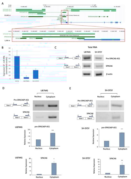 RNA-Seq of SF-miRNAs in the three neuronal cell lines (Figure 5B) revealed that the expression level of miR-99b is lower in the neuronal cancer cells compared to the normal HCN cells. The expression levels of the other two spliceosomal SF-miRNAs, miR-125 and Let-7e, also decrease in the cancer cell lines compared to the normal HCN cells (Supplementary Table S1). Because each of the three neuronal cell lines is distinct, we focused on each of them separately and tested the effect of miR-99b on each of these two cell lines (the HCN cell line was discontinued and thus was not analyzed for the effect of miR-99b). RT-PCR analysis of total RNA from the U87MG cells revealed the expression of pre-SPACA6-AS1 and SPACA6. Low levels of pre-SPACA6-AS1 and SPACA6 were found in total RNA from SH-SY5Y cells (Figure 5C). We next asked if the pre-SPACA6-AS1 is exported to the cytoplasm in neuronal cancer cells, or if it is retained in the nucleus. For this aim we isolated nuclei and cytoplasm from each of the neuronal cancer cells (see Section 4, Supplementary Figure S3) and analyzed the expression of pre-SPACA6-AS1 and SPACA6 by RT-PCR. Figure 5D,E show that pre-SPACA6-AS1 is found in both the nucleus and cytoplasm in both neuronal cancer cells, but the majority is exported to the cytoplasm.