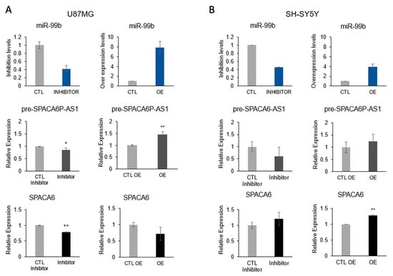miR-99b increases the level of pre-SPACA6-AS1 in U87mG and SH-SY5Y neuronal cancer cells. U87MG and SHSY5Y cell lines were transfected with anti-hsa-miR-99b inhibitor and pre-miR hsa-miR-99b. The effect of inhibition (left), or overexpression (OE, right) of miR-99b on the nuclear expression of pre-SPACA6-AS1 and SPACA6 mRNA was analyzed by real time PCR in U87MG (A) and SH-SY5Y (B) cell lines. The results of quantitative PCR representative of independent biological preparations are shown. The expression levels of SPACA6 and SPACA6-AS1 pre-mRNA was normalized to internal control of ß-actin expression from the same preparation. CTL, control; OE, overexpression; Inhibitor, anti-hsa-miR-99b inhibitor; CTR inhibitor, non-silencing anti-miR (see Section 4); CTR OE, pre-miR negative control (see Section 4). For statistical significance we indicated with ** and * the p-values (paired t-test) of <5 × 10−3, and <5 × 10−2, respectively.