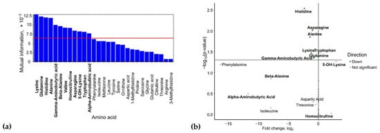 Based on mutual information index values, the following potential biomarkers of GDM were identified: lysine, glutamine, histidine, alanine, γ-aminobutyric acid, β-alanine, valine, homocitrulline, asparagine, 5-OH-lysine, tryptophan, and α-aminobutyric acid (