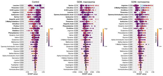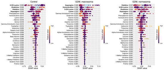 Figure 2). These same amino acids were identified as potential biomarkers for distinguishing between control and GDM groups. In GDM with macrosomia, we observed decreased levels of asparagine (FC = 0.39) and lysine (FC = 0.44), along with elevated levels of homocitrulline (FC = 4.9) and 5-OH-lysine (FC = 2.1). Also, the level of asparagine in the case of GDM with macrosomia was statistically significantly lower than in the control group (