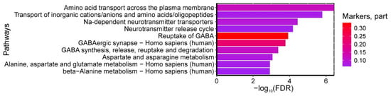 Analysis of metabolic pathway databases identified 45 statistically significant pathways enriched with amino acids differentiating control and GDM groups (maternal venous blood). The most relevant pathways included: (1) “Amino acid transport across plasma membrane” and “Transport of inorganic cations/anions and amino acids/oligopeptides” (β-alanine, alanine, γ-aminobutyric acid, glutamine-enriched); (2) “Na+-dependent neurotransmitter transporters” and “Neurotransmitter release cycle” (β-alanine, γ-aminobutyric acid, glutamine-enriched); (3) “GABA reuptake” and “GABA synthesis/release/reuptake/degradation” (β-alanine, γ-aminobutyric acid-enriched); (4) Reactome’s “Aspartate/asparagine metabolism” (β-alanine, glutamine-enriched); (5) KEGG’s “GABAergic synapse” and “Alanine/aspartate/glutamate metabolism” (glutamine, γ-aminobutyric acid-enriched); and (6) KEGG’s “Beta-alanine metabolism” (β-alanine, γ-aminobutyric acid-enriched). The pathways have FDR < 0.01 (