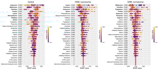 The control group exhibited lower levels of leucine (FC = 0.67), threonine (FC = 0.69), 5-OH-lysine (FC = 0.80), arginine (FC = 0.89), isoleucine (FC = 0.67), serine (FC = 0.68), aspartic acid (FC = 0.67), 3-methylhistidine (FC = 0.64), citrulline (FC = 0.71), proline (FC = 0.69), ornithine (FC = 0.73), histidine (FC = 0.94), and phenylalanine (FC = 0.81). With the exception of 5-OH-lysine and 3-methylhistidine, these amino acids were previously identified as potential biomarkers distinguishing controls from GDM cases. While isoleucine, serine, citrulline, proline, histidine, and phenylalanine were established as control group markers in umbilical cord blood, only isoleucine and serine showed consistent directional changes in both amniotic fluid and cord blood in GDM. Histidine and 5-OH-lysine were previously identified as control markers in serum, with only 5-OH-lysine showing consistent reduction in both serum and amniotic fluid. The GDM+macrosomia subgroup demonstrated elevated levels of serine (FC = 1.2), citrulline (FC = 1.4), 5-OH-lysine (FC = 1.1), leucine (FC = 1.4), isoleucine (FC = 1.2), threonine (FC = 1.1), and aspartic acid (FC = 1.1), alongside reduced γ-aminobutyric acid (FC = 0.88), phenylalanine (FC = 0.93), and ornithine (FC = 0.99). The increases in serine and threonine paralleled umbilical cord blood findings, while 5-OH-lysine elevation matched serum patterns. For normosomic GDM, characteristic elevations included arginine (FC = 1.2), 3-methylhistidine (FC = 1.6), ornithine (FC = 1.5), threonine (FC = 1.1), γ-aminobutyric acid (FC = 1.4), leucine (FC = 1.6), 5-OH-lysine (FC = 1.2), and isoleucine (FC = 1.4). Also, levels of arginine (