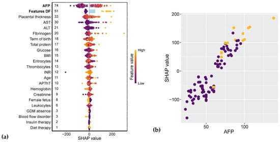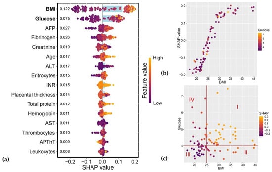 p < 0.05 considered significant) and median ratios, with final selection requiring either (1) significant Mann–Whitney results plus median ratios ≠ 1 or (2) absolute binary logarithms of median ratios > 1. For analyzing GDM and fetal macrosomia associations, we computed Shapley values [