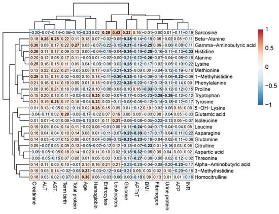 We performed Spearman’s correlation analysis to assess relationships between amino acid levels and clinical parameters in women with gestational diabetes mellitus (GDM), with statistical significance set at