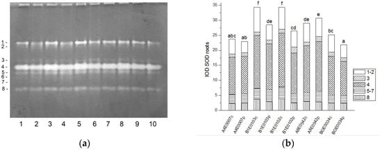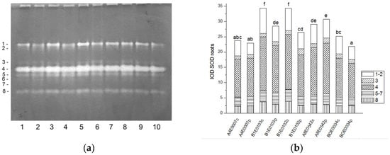 SOD isoform profile in cowpea roots: (a) Activity staining of a representative gel, equal protein load of 30 µg per lane; isoforms are numbered on the left. Accessions and control/PEG treatment on lanes (a): 1—A4E0007 c, 2—A4E0007 p, 3—B1E0103 c, 4—B1E0103 p, 5—B1E0102 c, 6—B1E0102 p, 7—A8E0542 c, 8—A8E0542 p, 9—BOE0034 c, 10—BOE0034 p. (b) Integrated relative SOD activity in arbitrary cumulative units (IOD 1.103) for the eight isoforms. Isoforms are with various patterns. Different letters above columns indicate statistically significant differences in SOD activity at the p 0.05 level among accessions/conditions.