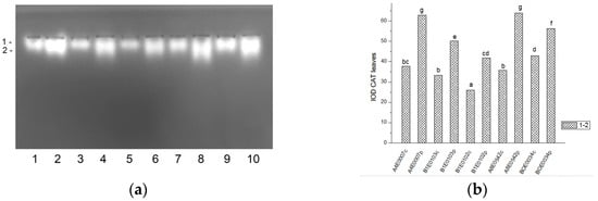 CAT activity pattern in cowpea roots: (a) Activity staining of a representative gel, 30 µg protein load per lane; isoforms are numbered on the left. Accessions and control/PEG treatment on lanes (a): 1—A4E0007 c, 2—A4E0007 p, 3—B1E0103 c, 4—B1E0103 p, 5—B1E0102 c, 6—B1E0102 p, 7—A8E0542 c, 8—A8E0542 p, 9—BOE0034 c, 10—BOE0034 p. (b) Integrated relative CAT activity in arbitrary units (IOD 1.103). Different letters above columns indicate statistically significant differences in CAT activity at the p 0.05 level among accessions/conditions.