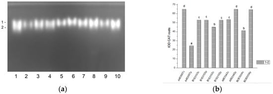 CAT activity pattern in cowpea leaves: (a) Activity staining of a representative gel, 10 µg protein load per lane; isoforms are numbered on the left. Accessions and control/PEG treatment on lanes (a): 1—A4E0007 c, 2—A4E0007 p, 3—B1E0103 c, 4—B1E0103 p, 5—B1E0102 c, 6—B1E0102 p, 7—A8E0542 c, 8—A8E0542 p, 9—BOE0034 c, 10—BOE0034 p. (b) Integrated relative CAT activity in arbitrary units (IOD 1.103). Different letters above columns indicate statistically significant differences in CAT activity at the p 0.05 level among accessions/conditions.