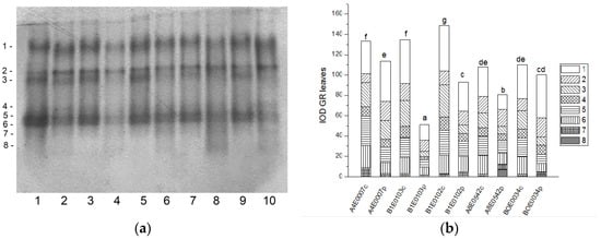 GR isoform profile in cowpea roots: (a) Activity staining of a representative gel, 20 µg protein load per lane; isoforms are numbered on the left. Accessions and control/PEG treatment on lanes (a): 1—A4E0007 c, 2—A4E0007 p, 3—B1E0103 c, 4—B1E0103 p, 5—B1E0102 c, 6—B1E0102 p, 7—A8E0542 c, 8—A8E0542 p, 9—BOE0034 c, 10—BOE0034 p. (b) Integrated relative GR activity in arbitrary units (IOD). Isoforms are with various patterns. Different letters above columns indicate statistically significant differences in GR activity at the p 0.05 level among accessions/conditions.