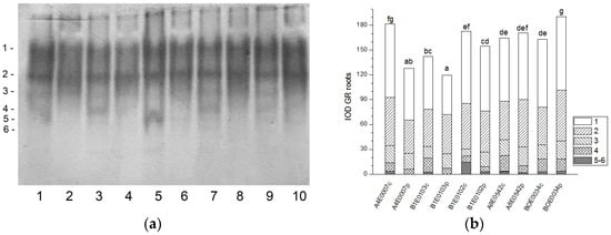 POX isoform profile in cowpea roots: (a) Activity staining of a representative gel, 30 µg protein load per lane; isoforms are numbered on the left. Accessions and control/PEG treatment on lanes (a): 1—A4E0007 c, 2—A4E0007 p, 3—B1E0103 c, 4—B1E0103 p, 5—B1E0102 c, 6—B1E0102 p, 7—A8E0542 c, 8—A8E0542 p, 9—BOE0034 c, 10—BOE0034 p. (b) Integrated relative POX activity in arbitrary units (IOD). Isoforms are with various patterns. Different letters above columns indicate statistically significant differences in POX activity at the p 0.05 level among accessions/conditions.