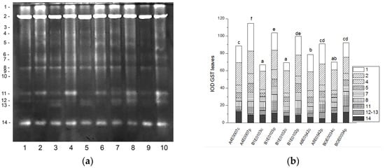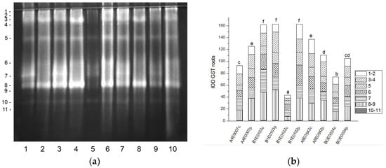 GST isoform profile in cowpea roots: (a) Activity staining of a representative gel, 20 µg protein load per lane; isoforms are numbered on the left. Accessions and control/PEG treatment on lanes (a): 1—A4E0007 c, 2—A4E0007 p, 3—B1E0103 c, 4—B1E0103 p, 5—B1E0102 c, 6—B1E0102 p, 7—A8E0542 c, 8—A8E0542 p, 9—BOE0034 c, 10—BOE0034 p. (b) Integrated relative GST activity in arbitrary units (IOD 1.103). Isoforms are with various patterns. Different letters above columns indicate statistically significant differences in GST activity at the p 0.05 level among accessions/conditions.
