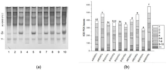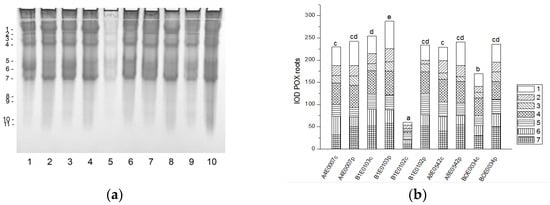 POX isoform profile in cowpea leaves: (a) Activity staining of a representative gel, 30 µg protein load per lane; isoforms are numbered on the left. Accessions and control/PEG treatment on lanes (a): 1—A4E0007 c, 2—A4E0007 p, 3—B1E0103 c, 4—B1E0103 p, 5—B1E0102 c, 6—B1E0102 p, 7—A8E0542 c, 8—A8E0542 p, 9—BOE0034 c, 10—BOE0034 p. (b) Integrated relative POX activity in arbitrary units (IOD). Isoforms are with various patterns. Different letters above columns indicate statistically significant differences in POX activity at the p 0.05 level among accessions/conditions.