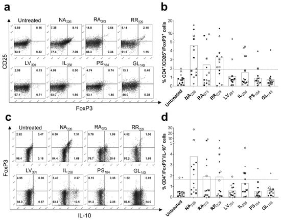 Treg cell epitopes were validated using fresh PPMCs from 14 healthy blood donors. PBMCs were cultured at 2 × 106 cells per well in 24-well plates (Corning, Corning, NY, USA) using 1000 µL of RPMI complete medium supplemented with IL-2 10 U/mL (Immunotools, Friesoythe, Germany) and stimulated with individual peptides or peptide pools (10 µM per peptide). As a control, cells were incubated without peptides, in medium with 0.3% DMSO (Untreated cells). Plates were incubated at 37 °C in 5% CO2 for 6 days. Peptides and IL-2 were renewed every 2 days, and 200 μL of growth medium was replenished. After 6-day cultures, cells were stimulated with 50 ng/mL phorbol 12-myristate 13-acetate (PMA) (Sigma Aldrich, Darmstadt, Germany) and 1 μg/mL ionomycin (Sigma Aldrich, Darmstadt, Germany) in the presence of 10 μg/mL Brefeldin A (Thermo Fisher, Waltham, MA, USA) for 4 h at 37 °C in 5% CO2. Next, cells were washed with PBS and surface stained with anti-CD4 (MEM-241, FITC, Immunotools, Friesoythe, Germany) antibody alone or with anti-CD25 (MEM-181, APC, Immunotools, Friesoythe, Germany) antibody. Subsequently, cells were fixed, permeabilized and stained intracellularly with anti-FoxP3 (236A/E7, PE, BD Biosciences (Franklin Lakes, NJ, USA) or 3G3, APC, Immunotools (Friesoythe, Germany)) antibody in combination with anti-IL-10 (JES3-19F1, APC, BD Biosciences, Franklin Lakes, NJ, USA) or anti-TGF-β1 (TW4-gE7, PE, BD Biosciences, Franklin Lakes, NJ, USA) antibodies and then analyzed by flow cytometry (FACSCalibur, BD Biosciences, Franklin Lakes, NJ, USA) to detect CD4+CD25+FoxP3+, CD4+FoxP3+IL-10+ and CD4+FoxP3+TGF-β+ Treg cells. Similarly, Tr1 cells were detected in PBMCs stimulated as previously indicated after extracellular stainings with antibodies anti-CD4 (SK3, APC/Cyanine7, Biolegend, San Diego, CA, USA), anti-CD49b (P1E6-C5, PE/Cyanine7, Biolegend, San Diego, CA, USA) and anti-LAG-3 (11C3C65, BV650, Biolegend, San Diego, CA, USA), followed by intracellular stainings with antibodies anti-FoxP3 (236A/E7, PE, BD Biosciences, Franklin Lakes, NJ, USA) and anti-IL-10 (JES3-19F1, APC, BD Biosciences). Detection was performed using flow cytometry (FACSCelesta, BD Biosciences, Franklin Lakes, NJ, USA).