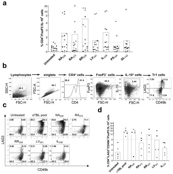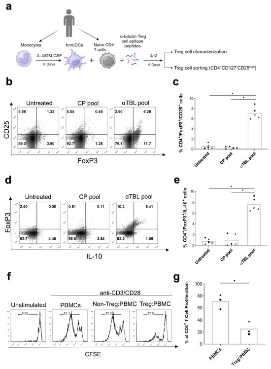 Monocyte-derived dendritic cells (moDCs) were generated by culturing monocytes in 48-well plates (1 × 106 cells/well) with 500 µL of RPMI complete medium per well, supplemented with IL-4 (Immunotools, Friesoythe, Germany) and granulocyte–macrophage colony-stimulating factor (GM-CSF) (Immunotools, Friesoythe, Germany) at a concentration of 100 ng/mL each. Cells were incubated at 37 °C and 5% CO2 for 6 days. Cytokines were renewed at day 4, and 100 μL of growth medium was replenished every 2 days. moDCs obtained as described were plated in 48-well plates at a cellular density of 0.2 × 106 cells/well, together with purified autologous naive CD4+ T cells at a ratio of 1:5 (moDC: naive CD4+ T cells) in 500 μL of RPMI complete medium. The α TBL pool or CP pool (control self-peptides) (10 µM/peptide) and IL-2 (10 U/mL) were added to co-cultures on days 0 and 4 of the experiment, and 100 μL of growth medium was replenished every 2 days. As a control, cells were incubated without peptides, in the presence of 0.3% DMSO (Untreated cells). Plates were incubated at 37 °C with CO2 for 6 days. Subsequently, cells were harvested, washed with PBS and subjected to surface and intracellular staining with antibodies anti-CD4 (SK3, APC/Cyanine7, Biolegend, San Diego, CA, USA), anti-CD25 (MEM-181, APC, Immunotools, Friesoythe, Germany), anti-FoxP3 (206D, BV421, Biolegend), anti-IL-10 (JES3-9D7, PE, Biolegend, San Diego, CA, USA), anti-Helios (22F6, FITC, Biolegend, San Diego, CA, USA) and anti-Nrp1 (12C2, BV650, Biolegend, San Diego, CA, USA). Finally, cells were acquired on a FACSCelesta flow cytometer (BD Biosciences, Franklin Lakes, NJ, USA).