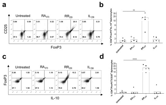 Selected Treg cell epitopes were validated using fresh splenocytes isolated from five mice. Splenocytes from C57BL/6 were plated in 24-well plates (2 × 106 cells/well) and incubated in RPMI complete medium, including 10% of heat inactivated FBS and 50 μM of β-mercaptoethanol and 10 ng/mL of recombinant mouse IL-2 (Immunotools, Friesoythe, Germany). Cells were stimulated with individual peptides (10 µM/peptide) and plates were incubated at 37 °C with 5% CO2 for 3 days. As a control, cells were incubated without peptides, in medium with 0.3% DMSO (Untreated cells). After the 3-day incubation, cells were stimulated with 50 ng/mL PMA and 1 μg/mL ionomycin in the presence of 10 μg/mL Brefeldin A (Thermo Fisher, Waltham, MA, USA) for 4 h at 37 °C in 5% CO2. Then, cells were washed with PBS and surface stained using anti-CD4 (GK1.5, FITC, Immunotools, Friesoythe, Germany) and anti-CD25 (PC61.5.3, APC, Immunotools, Friesoythe, Germany) antibodies. Next, cells were fixed, permeabilized and stained intracellularly with antibodies anti-FoxP3 (3G3, PE, Immunotools, Friesoythe, Germany) and anti-IL-10 (JES5-16E3, APC, BD Biosciences, Franklin Lakes, NJ, USA). Finally, cells were acquired on a FACSCalibur flow cytometer (BD Biosciences, Franklin Lakes, NJ, USA) and CD4+CD25+FoxP3+ and CD4+FoxP3+IL-10+ cell populations analyzed.