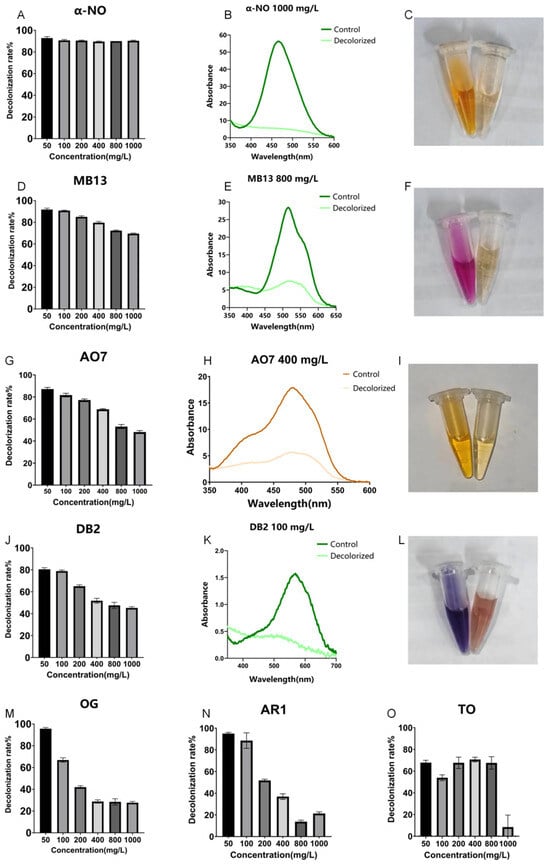 Decolorization of different azo dyes by crude laccase from the yang1 strain (1 U/mL) at 30 °C. (A). Decolorization efficiencies of different concentrations of azo dye α-NO treated with 1 U/mL crude laccase (24 h). (B). Spectral scanning graph of azo dye α-NO before and after treatment with 1 U/mL crude laccase (dye concentration: 1000 mg/L). (C). Color change diagram of azo dye α-NO before and after laccase decolorization (left—before decolorization, right—after decolorization). (D). Decolorization efficiencies of different concentrations of azo dye MB13 treated with 1 U/mL crude laccase (24 h). (E). Spectral scanning graph of azo dye MB13 before and after treatment with 1 U/mL crude laccase (dye concentration: 800 mg/L). (F). Color change diagram of azo dye MB13 before and after laccase decolorization (left—before decolorization, right—after decolorization). (G). Decolorization efficiencies of different concentrations of azo dye AO7 treated with 1 U/mL crude laccase (24 h). (H). Spectral scanning graph of azo dye AO7 before and after treatment with 1 U/mL crude laccase (dye concentration: 400 mg/L). (I). Color change diagram of azo dye AO7 before and after laccase decolorization (left—before decolorization, right—after decolorization). (J). Decolorization efficiencies of different concentrations of azo dye DB2 treated with 1 U/mL crude laccase (24 h). (K). Spectral scanning graph of azo dye DB2 before and after treatment with 1 U/mL crude laccase (dye concentration: 100 mg/L). (L). Color change diagram of azo dye DB2 before and after laccase decolorization (left—before decolorization, right—after decolorization). (M). Decolorization efficiencies of different concentrations of azo dye OG treated with 1 U/mL crude laccase (24 h). (N). Decolorization efficiencies of different concentrations of azo dye AR1 treated with 1 U/mL crude laccase (24 h). (O). Decolorization efficiencies of different concentrations of azo dye TO treated with 1 U/mL crude laccase (24 h).