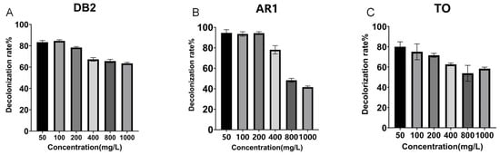 Decolorization of different azo dyes by crude laccase from the yang1 strain (2 U/mL) at 30 °C. (A). Decolorization efficiencies of different concentrations of azo dye DB2 treated with 2 U/mL crude laccase (24 h). (B). Decolorization efficiencies of different concentrations of azo dye AR1 treated with 2 U/mL crude laccase (24 h). (C). Decolorization efficiencies of different concentrations of azo dye TO treated with 2 U/mL crude laccase (24 h).