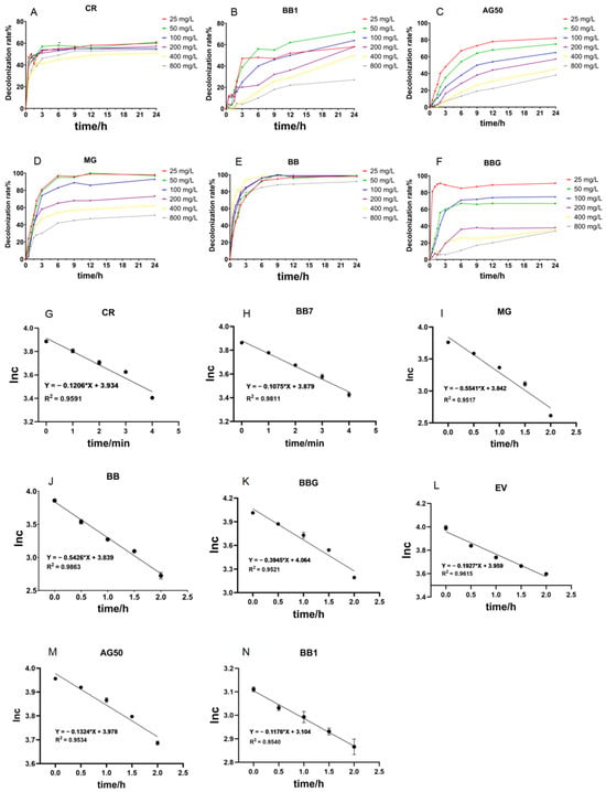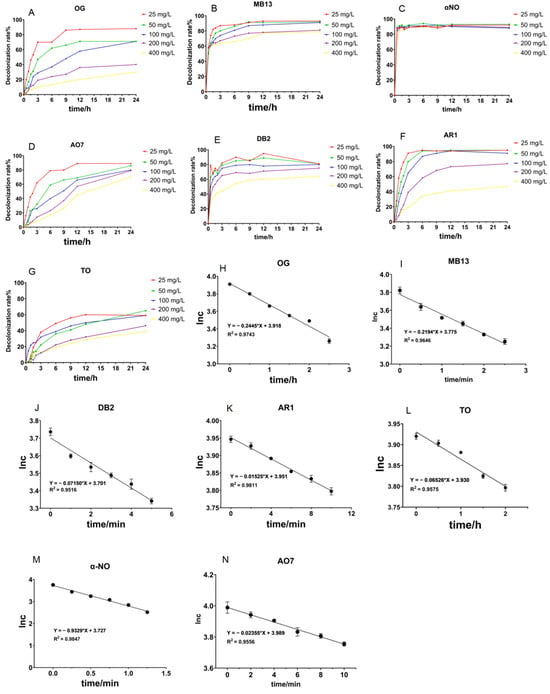 Time course decolorization of different azo dyes by crude laccase from the yang1 strain (1 U/mL) at 30 °C and ln c–t curves of the decolorization process of azo dyes. (A–G): Time course decolorization of different azo dyes by crude laccase ((A–D) at 1 U/mL, (E–G) at 2 U/mL). (H–N): ln c–t curves of the decolorization process of azo dyes by crude laccase. The unit of measurement for c is mg/L.