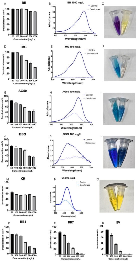 Decolorization of different triphenylmethane dyes by crude laccase from the yang1 strain at 30 °C. (A,D,G,J,M,P,Q,R): Decolorization efficiencies of different concentrations of triphenylmethane dyes BB, MG, AG50, BBG, CR, BB1, BB7, and EV treated with 1 U/mL crude laccase (24 h). (B,E,H,K,N): Spectral scanning graph of triphenylmethane dyes BB, MG, AG50, BBG, and CR before and after treatment with 1 U/mL crude laccase. (C,F,I,L,O): Color change diagram of the BB, MG, AG50, BBG, and CR dyes before and after laccase decolorization (left—before decolorization, right—after decolorization).