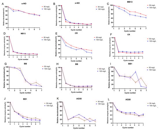 Continuous batch decolorization of various azo and triphenylmethane dyes using crude laccase at 30 °C. (A): The relative decolorization efficiency of crude laccase for azo dye α-NO over 7 consecutive 24 h batch decolorization rounds. (B): The relative laccase activity of crude laccase in the decolorization of azo dye α-NO across 7 consecutive 24 h batches. (C): The relative decolorization efficiency of crude laccase for azo dye MB13 over 7 consecutive 24 h batch decolorization rounds. (D): The relative laccase activity of crude laccase in the decolorization of azo dye MB13 across 7 consecutive 24 h batches. (E): The relative decolorization efficiency of crude laccase for triphenylmethane dye CR over 7 consecutive 24 h batch decolorization rounds. (F): The relative laccase activity of crude laccase in the decolorization of triphenylmethane dye CR across 7 consecutive 24 h batches. (G): The relative decolorization efficiency of crude laccase for triphenylmethane dye BB over 7 consecutive 24 h batch decolorization rounds. (H): The relative laccase activity of crude laccase in the decolorization of triphenylmethane dye BB across 7 consecutive 24 h batches. (I): The relative decolorization efficiency of crude laccase for triphenylmethane dye BB1 over 7 consecutive 24 h batch decolorization rounds. (J): The relative laccase activity of crude laccase in the decolorization of triphenylmethane dye BB1 across 7 consecutive 24 h batches. (K): The relative decolorization efficiency of crude laccase for triphenylmethane dye AG50 over 7 consecutive 24 h batch decolorization rounds. (L): The relative laccase activity of crude laccase in the decolorization of triphenylmethane dye AG50 across 7 consecutive 24 h batches.