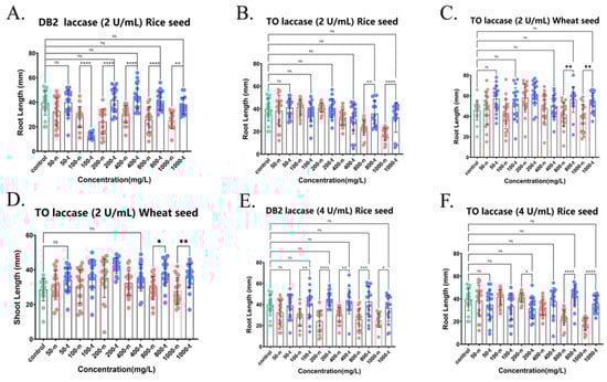 Detoxification of phytotoxicity of various azo dyes, DB2 and TO, by crude laccase (2 U/mL, 4 U/mL). (A). Effects of DB2 not treated by 2 U/mL crude laccase and DB2 treated by 2 U/mL crude laccase on the root growth of rice seeds. (B). Effects of TO not treated by 2 U/mL crude laccase and TO treated by 2 U/mL crude laccase on the root growth of rice seeds. (C). Effects of TO not treated by 2 U/mL crude laccase and TO treated by 2 U/mL crude laccase on the root growth of wheat seeds. (D). Effects of TO not treated by 2 U/mL crude laccase and TO treated by 2 U/mL crude laccase on the shoot growth of wheat seeds. (E). Effects of DB2 not treated by 4 U/mL crude laccase and DB2 treated by 4 U/mL crude laccase on the root growth of rice seeds. (F). Effects of TO not treated by 4 U/mL crude laccase and TO treated by 4 U/mL crude laccase on the root growth of rice seeds. ns meant no significant difference between groups, p > 0.05; * meant a significant difference between groups, p ≤ 0.05; ** meant a highly significant difference between groups, p ≤ 0.01; *** meant an extremely significant difference between groups, p ≤ 0.001; and **** meant an exceedingly significant difference between groups, p ≤ 0.0001. Green dots represents the blank control group. Red dots represents the control group (with dye, no crude laccase). Blue dots represents the experimental group (with both dye and crude laccase).