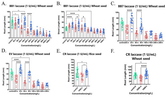 Detoxification of phytotoxicity of various triphenylmethane dyes BB1, BB7, EV, and CR by crude laccase (1 U/mL). (A). Effects of BB1 not treated by 1 U/mL crude laccase and BB1 treated by 1 U/mL crude laccase on the root growth of wheat seeds. (B). Effects of BB1 not treated by 1 U/mL crude laccase and BB1 treated by 1 U/mL crude laccase on the shoot growth of wheat seeds. (C). Effects of BB7 not treated by 1 U/mL crude laccase and BB7 treated by 1 U/mL crude laccase on the root growth of wheat seeds. (D). Effects of EV not treated by 1 U/mL crude laccase and EV treated by 1 U/mL crude laccase on the root growth of wheat seeds. (E). Effects of CR not treated by 1 U/mL crude laccase and CR treated by 1 U/mL crude laccase on the root growth of rice seeds. (F). Effects of CR not treated by 1 U/mL crude laccase and CR treated by 1 U/mL crude laccase on the root growth of wheat seeds. ns meant no significant difference between groups, p > 0.05; * meant a significant difference between groups, p ≤ 0.05; *** meant an extremely significant difference between groups, p ≤ 0.001; and **** meant an exceedingly significant difference between groups, p ≤ 0.0001. Green dots represents the blank control group. Red dots represents the control group (with dye, no crude laccase). Blue dots represents the experimental group (with both dye and crude laccase).