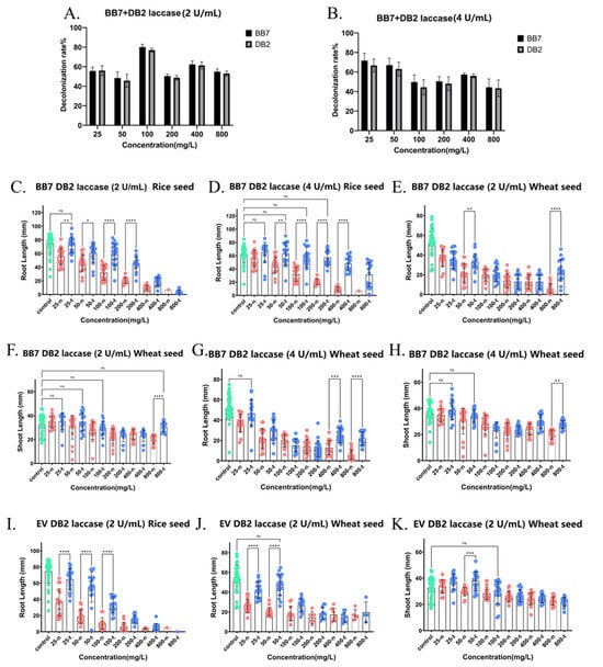 Figure 9I–N show the effects of the DB2 + EV dye mixture on the root and shoot growth of rice and wheat seeds before and after laccase decolorization. As shown in Figure 9I, the root lengths of rice seeds treated with crude laccase (25-t, 50-t, and 100-t) were 1.79, 2.93, and 3.32 times longer than those before treatment (25-n, 50-n, and 100-n), respectively (p < 0.0001). The above results showed that treating rice seeds with crude laccase (2 U/mL) could significantly attenuate the toxicity of 25 + 25, 50 + 50, and 100 + 100 mg/L DB2 + EV on the root growth. The treatment with crude laccase (2 U/mL) demonstrated good detoxification effects on the toxicity of DB2 + EV mixed dye towards rice seed root growth (Figure 9I). As shown in Figure 9J, the root lengths of wheat seed in 25 + 25 and 50 + 50 mg/L DB2 + EV (25-t and 50-t) treated with crude laccase (2 U/mL) were 1.60 and 2.31 times longer than those before laccase treatment (25-n and 50-n) (p < 0.0001). There was no significant difference (p > 0.05) in root length between the laccase-treated groups (25-t and 50-t) and blank control group (0 mg/L, control). The above results showed that treatment with crude laccase (2 U/mL) was able to totally remove the toxicity of 25 + 25 and 50 + 50 mg/L DB2 + EV dye mixture on wheat seed root growth (Figure 9J). As shown in Figure 9L–N, the treatment of crude laccase (4 U/mL) could also significantly reduce or completely eliminate the toxicity of DB2 + EV mixed dyes on the shoot and root growth of wheat seed and rice seed (Figure 9L–N). In summary, the treatment with crude laccase demonstrated excellent detoxification effects on the toxicity of DB2 + EV mixed dye towards both wheat and rice seeds.