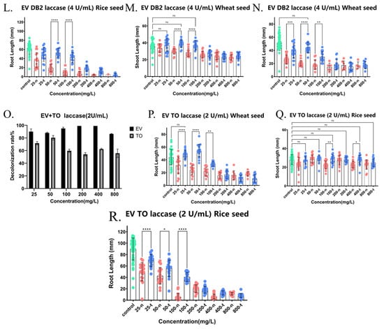 Detoxification of phytotoxicity of mixtures of two dyes (azo dye + triphenylmethane dye, BB7 + DB2, EV + DB2, EV + TO) by crude laccase. (A). 24 h decolorization efficiencies for BB7 + DB2 mixture at varying concentrations treated with 2 U/mL crude laccase. (B). 24 h decolorization efficiencies for BB7 + DB2 mixture at varying concentrations treated with 4 U/mL crude laccase. (C). Effects of BB7 + DB2 not treated by 2 U/mL crude laccase and BB7 + DB2 treated by 2 U/mL crude laccase on the root growth of rice seeds. (D). Effects of BB7 + DB2 not treated by 4 U/mL crude laccase and BB7 + DB2 treated by 4 U/mL crude laccase on the root growth of rice seeds. (E). Effects of BB7 + DB2 not treated by 2 U/mL crude laccase and BB7 + DB2 treated by 2 U/mL crude laccase on the root growth of wheat seeds. (F). Effects of BB7 + DB2 not treated by 2 U/mL crude laccase and BB7 + DB2 treated by 2 U/mL crude laccase on shoot growth of wheat seeds. (G). Effects of BB7 + DB2 not treated by 4 U/mL crude laccase and BB7 + DB2 treated by 4 U/mL crude laccase on root growth of wheat seeds. (H). Effects of BB7 + DB2 not treated by 4 U/mL crude laccase and BB7 + DB2 treated by 4 U/mL crude laccase on shoot growth of wheat seeds. (I). Effects of EV + DB2 not treated by 2 U/mL crude laccase and EV + DB2 treated by 2 U/mL crude laccase on root growth of rice seeds. (J). Effects of EV + DB2 not treated by 2 U/mL crude laccase and EV + DB2 treated by 2 U/mL crude laccase on root growth of wheat seeds. (K). Effects of EV + DB2 not treated by 2 U/mL crude laccase and EV + DB2 treated by 2 U/mL crude laccase on shoot growth of wheat seeds. (L). Effects of EV + DB2 not treated by 4 U/mL crude laccase and EV + DB2 treated by 4 U/mL crude laccase on root growth of rice seeds. (M). Effects of EV + DB2 not treated by 4 U/mL crude laccase and EV + DB2 treated by 4 U/mL crude laccase on shoot growth of wheat seeds. (N). Effects of EV + DB2 not treated by 4 U/mL crude laccase and EV + DB2 treated by 4 U/mL crude laccase on root growth of wheat seeds. (O). 24 h decolorization efficiencies for EV + TO mixture at varying concentrations treated with 2 U/mL crude laccase. (P). Effects of EV + TO not treated by 2 U/mL crude laccase and EV + TO treated by 2 U/mL crude laccase on root growth of wheat seeds. (Q). Effects of EV + TO not treated by 2 U/mL crude laccase and EV + TO treated by 2 U/mL crude laccase on shoot growth of rice seeds. (R). Effects of EV + TO not treated by 2 U/mL crude laccase and EV + TO treated by 2 U/mL crude laccase on root growth of rice seeds. xx-n: untreated by laccase. xx-t: treated by laccase. ns meant no significant difference between groups, p > 0.05; * meant a significant difference between groups, p ≤ 0.05; ** meant a highly significant difference between groups, p ≤ 0.01; *** meant an extremely significant difference between groups, p ≤ 0.001; and **** meant an exceedingly significant difference between groups, p ≤ 0.0001. Green dots represents the blank control group. Red dots represents the control group (with dye, no crude laccase). Blue dots represents the experimental group (with both dye and crude laccase).