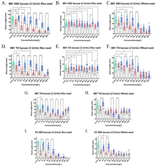Detoxification of phytotoxicity of mixtures of two dye (azo dye + triphenylmethane dye, BB1 + DB2, BB1 + TO, BB7 + TO, EV + DB2) by crude laccase. (A). Effects of untreated BB1 + DB2 mixture and BB1 + DB2 mixture treated with 2 U/mL crude laccase on root growth of rice seeds. (B). Effects of untreated BB1 + DB2 mixture and BB1 + DB2 mixture treated with 2 U/mL crude laccase on shoot growth of rice seeds. (C). Effects of untreated BB1 + DB2 mixture and BB1 + DB2 mixture treated with 2 U/mL crude laccase extract on root growth of wheat seeds. (D). Effects of untreated BB1 + TO mixture and BB1 + TO mixture treated with 2 U/mL crude laccase on root growth of rice seeds. (E). Effects of untreated BB1 + TO mixture and BB1 + TO mixture treated with 2 U/mL crude laccase on shoot growth of rice seeds. (F). Effects of untreated BB1 + TO mixture and BB1 + TO mixture treated with 2 U/mL crude laccase on root growth of wheat seeds. (G). Effects of untreated BB7 + TO mixture and BB7 + TO mixture treated with 2 U/mL crude laccase extract on root growth of rice seeds. (H). Effects of untreated BB7 + TO mixture and BB7 + TO mixture treated with 2 U/mL crude laccase on root growth of wheat seeds. (I). Effects of untreated EV + DB2 mixture and EV + DB2 mixture treated with 2 U/mL crude laccase on root growth of rice seeds. (J). Effects of untreated EV + DB2 mixture and EV + DB2 mixture treated with 2 U/mL crude laccase on root growth of wheat seeds. xx-n: untreated by laccase. xx-t: treated by laccase. ns meant no significant difference between groups, p > 0.05; * meant a significant difference between groups, p ≤ 0.05; ** meant a highly significant difference between groups, p ≤ 0.01; *** meant an extremely significant difference between groups, p ≤ 0.001; and **** meant an exceedingly significant difference between groups, p ≤ 0.0001. Green dots represents the blank control group. Red dots represents the control group (with dye, no crude laccase). Blue dots represents the experimental group (with both dye and crude laccase).