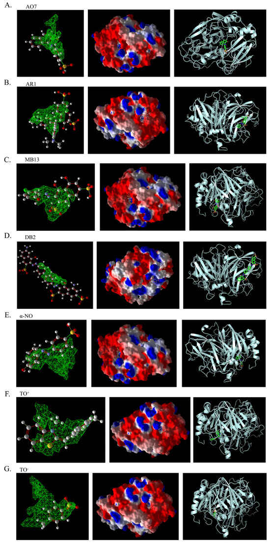 Three-dimensional structural images of molecular docking of different azo dyes and laccase using Molegro Virtual Docker (MVD). The first column is the 3D binding image of the dye ligand to the predicted binding pocket generated by MVD; the second column is the 3D binding image of the dye to the electrostatic surface of laccase generated by MVD; and the third column is the 3D binding image of the dye to laccase generated by PyMOL. (A). AO7. (B). AR1. (C). MB13. (D) DB2. (E). α-NO. (F). TO+. (G). TO-.