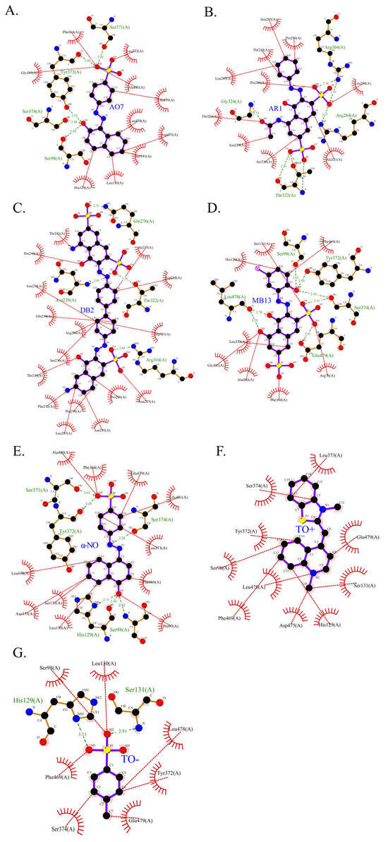 Two-dimensional structure of molecular docking of different azo dyes and laccase. The purple stick model represents the ligand, the orange stick model represents the protein structure, the red dashed line represents representative hydrophobic interactions, the red serrated semicircle represents amino acid residues that have hydrophobic interactions with the ligand, and the green dashed line represents hydrogen bonds. (A–G). (A). AO7. (B). AR1. (C). DB2. (D). MB13. (E). α-NO. (F). TO+. (G). TO-.