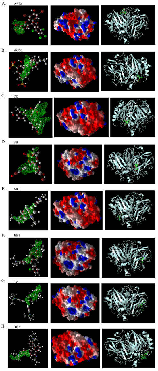 Three-dimensional structural images of molecular docking of different triphenylmethane dyes and laccase using Molegro Virtual Docker (MVD). The first column is the 3D binding image of the dye ligand to the predicted binding pocket generated by MVD; the second column is the 3D binding image of the dye to the electrostatic surface of laccase generated by MVD; and the third column is the 3D binding image of the dye to laccase generated by PyMOL. (A). AR92. (B). AG50. (C). CR. (D) BB. (E). MG. (F). BB1. (G). EV. (H). BB7.