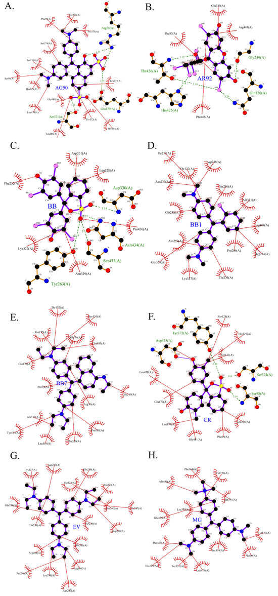 Two-dimensional structure of molecular docking of different triphenylmethane dyes and laccase. The purple stick model represents the ligand, the orange stick model represents the protein structure, the red dashed line represents representative hydrophobic interactions, the red serrated semicircle represents amino acid residues that have hydrophobic interactions with the ligand, and the green dashed line represents hydrogen bonds. (A). AG50. (B). AR92. (C). BB. (D). BB1. (E). BB7. (F). CR. (G). EV. (H). MG.