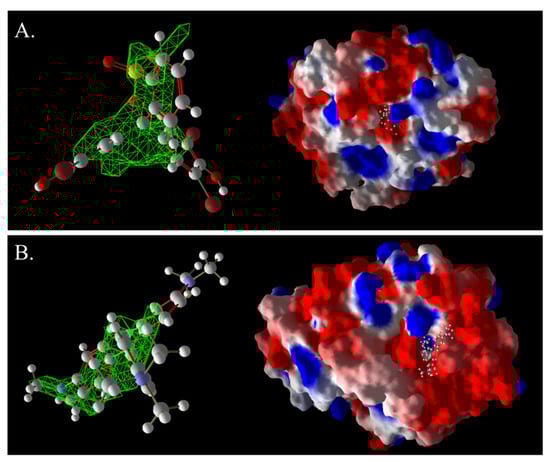 Three-dimensional images of BB and laccase complexes (A) and 3D images of MG and laccase complexes (B). The green grid represents a predictive docking pocket.