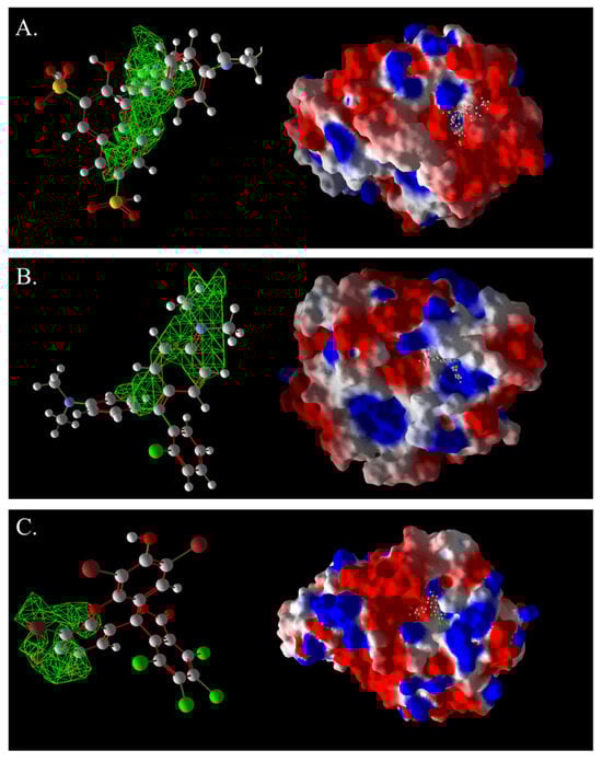 Three-dimensional images of AG50, BB7, AR92, and laccase complexes. (A): AG50; (B): BB7; (C): AR92. The green grid represents a predictive docking pocket.