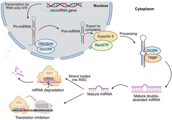 Biogenesis of microRNAs. RNA polymerase II typically transcribes miRNA genes to produce primary transcripts (pri-miRNAs). The microprocessor complex—comprising DROSHA and the RNA-binding protein DGCR8—cleaves pri-miRNAs to generate ~85-nt precursor miRNAs (pre-miRNAs). After nuclear export via the RanGTP/Exportin-5 complex, DICER processes pre-miRNAs into ~20–22-nt miRNA/miRNA duplexes. The mature strand is then incorporated into the RNA-induced silencing complex (RISC), which represses translation or induces mRNA degradation, depending on the degree of base-pairing complementarity. DGCR8—DiGeorge syndrome critical region 8; DICER—RNase III endoribonuclease; DROSHA—RNase III endoribonuclease; miRNA—microRNA; pre-miRNA—precursor microRNA; pri-miRNA—primary microRNA; RanGTP—RAS-related nuclear protein; RISC—RNA-induced silencing complex; TRBP—TAR RNA-binding protein.