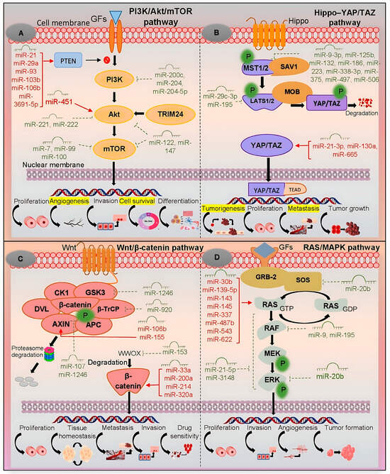 Signaling pathways in cancer progression include the PI3K/Akt/mTOR, Hippo–YAP/TAZ, Wnt/β-catenin, and RAS/MAPK pathways. The figure highlights the regulatory roles of miRNAs in these networks, either promoting or inhibiting tumor-related processes such as proliferation, invasion, angiogenesis, metastasis, apoptosis, and drug resistance. (A) In the PI3K/Akt/mTOR pathway, miRNAs regulate central effectors including PI3K, Akt, and mTOR, thereby influencing cell survival and differentiation. (B) In the Hippo–YAP/TAZ pathway, miRNAs control upstream kinases and YAP/TAZ transcriptional activity, shaping tumorigenesis and metastatic potential. (C) In the Wnt/β-catenin pathway, miRNAs modulate β-catenin stability and transcriptional activity, contributing to tissue homeostasis, invasion, and therapy sensitivity. (D) In the RAS/MAPK pathway, miRNAs target RAS, RAF, MEK, and ERK signaling, driving tumor growth, angiogenesis, and invasive behavior. miRNAs shown in green function as tumor suppressors, whereas those in red act as oncomiRs, underscoring their dual roles in cancer. Akt—protein kinase B; APC—adenomatous polyposis coli; AXIN—axis inhibition protein; β-TrCP—beta-transducin repeat-containing protein; CK1—casein kinase 1; DVL—Dishevelled segment polarity protein; ERK—extracellular signal-regulated kinase; GDP—guanosine diphosphate; GF—growth factor; GRB-2—growth factor receptor-bound protein 2; GSK3—glycogen synthase kinase 3; GTP—guanosine triphosphate; LATS1/2—large tumor suppressor kinases 1 and 2; MAPK—mitogen-activated protein kinase; MEK—MAP/ERK kinase; miR—microRNA; MOB—Mps one binder; MST1/2—mammalian Ste20-like serine/threonine kinases 1 and 2; mTOR—mechanistic (mammalian) target of rapamycin; P—protein; PI3K—phosphatidylinositol 3-kinase; PTEN—phosphatase and tensin homolog; RAF—rapidly accelerated fibrosarcoma; RAS—rat sarcoma small GTPase; SAV1—Salvador family WW domain-containing protein 1; SOS—Son of Sevenless; TEAD—TEA domain transcription factor; TRIM24—tripartite motif-containing 24; Wnt—Wingless/Int-1; WWOX—WW domain-containing oxidoreductase; YAP/TAZ—Yes-associated protein/transcriptional co-activator with PDZ-binding motif.