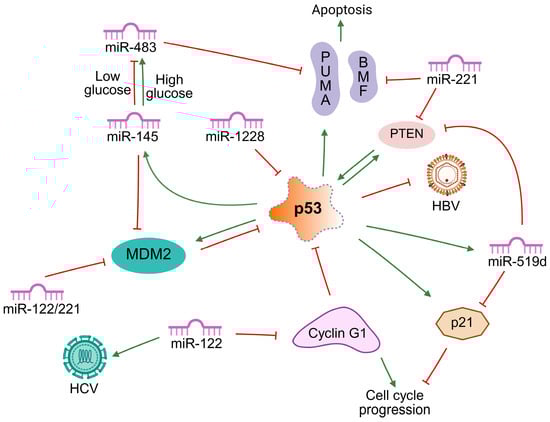 Interactions between key miRNAs (miR-122, miR-145, miR-221, miR-483-3p, miR-519d, miR-1228) and the p53 pathway, including its regulators (MDM2, PTEN, cyclin G1). The figure illustrates their roles in apoptosis, cell-cycle control, and viral modulation (HBV/HCV), showing how miRNAs either suppress or enhance p53 activity. Green arrows indicate gene induction or protein activation, whereas red lines denote gene repression or protein inhibition. BMF—B-cell lymphoma 2 modifying factor; HBV—hepatitis B virus; HCV—hepatitis C virus; MDM2—murine double minute 2; miR—microRNA; p21—cyclin-dependent kinase inhibitor 1A; p53—tumor protein p53; PTEN—phosphatase and tensin homolog; PUMA—p53 upregulated modulator of apoptosis.