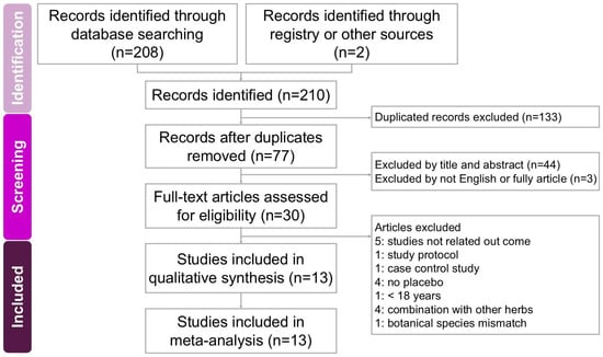 Flowchart showing the study selection process for this systematic review and meta-analysis on the effects of mulberry extract interventions for improving metabolic risk factors. From an initial 210 records identified, 13 studies met the inclusion criteria and were included in the final analysis [,,,,,,,,,,,,].