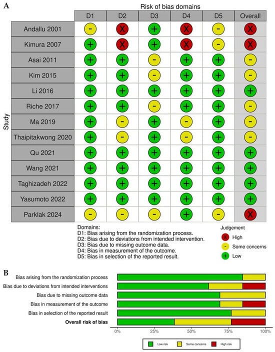 The risk of bias in the included studies was evaluated using the Cochrane Risk of Bias 2.0 tool. Figure 2A presents the domain-level assessments for each study, while Figure 2B summarizes the overall distribution of risk levels. Of the thirteen studies included, five were rated as having a low overall risk of bias, five were classified as having some concerns, and three were judged to be at high risk. The domains most commonly associated with high risk were deviations from intended interventions and measurement of outcomes, particularly in the studies by Andallu [], Kimura [], and Parklak []. These studies contributed to the overall classification of high risk. The domains related to randomization and selection of reported results were most consistently rated as low risk. Similarly, bias due to missing outcome data was generally assessed as low risk or as presenting only some concerns. In summary, most studies demonstrated acceptable methodological quality; however, limitations related to blinding, adherence, or selective reporting were noted in certain studies and should be considered when interpreting the pooled results.