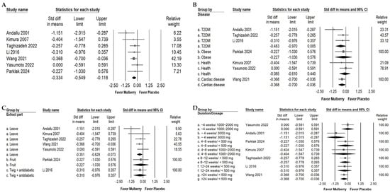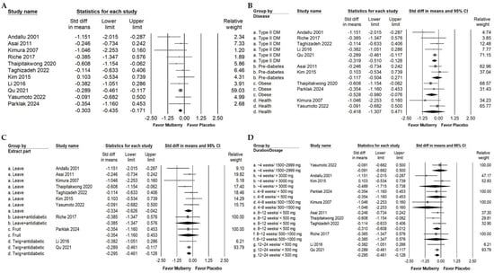 Forest plot summarizing the impact of mulberry extract supplementation on fasting blood glucose levels. Panel (A) presents the overall effect on fasting blood glucose. Elevated fasting blood glucose reflects impaired glycemic control and is associated with higher risks of type 2 diabetes, endothelial dysfunction, and vascular cognitive impairment. Panel (B) examines effects by diagnosis, Panel (C) evaluates outcomes by part of mulberry, and Panel (D) evaluates duration and dosage. Squares represent individual study effect estimates with 95% confidence intervals, while the diamonds at the bottom of each panel depict the pooled effect size, highlighting the overall impact on fasting blood glucose.